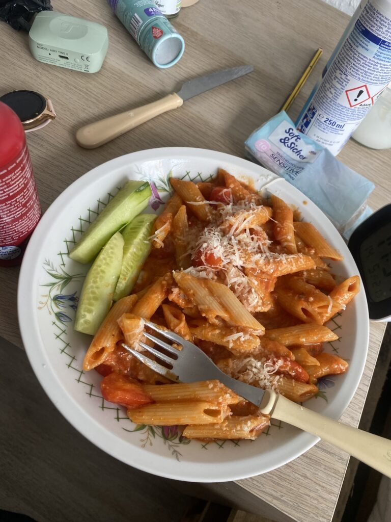 Zum Abendessen gab’s Nudeln mit Tomatensoße…ich hab dann noch Netflix geschaut und mein Buch fertig gelesen…jetzt gehe ich schlafen hoffentlich habe ich morgen wieder mehr Energie….