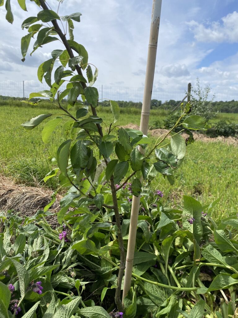 Die Biomasse die wir abschneiden mulchen wir immer an die Bäme oder die Schwart